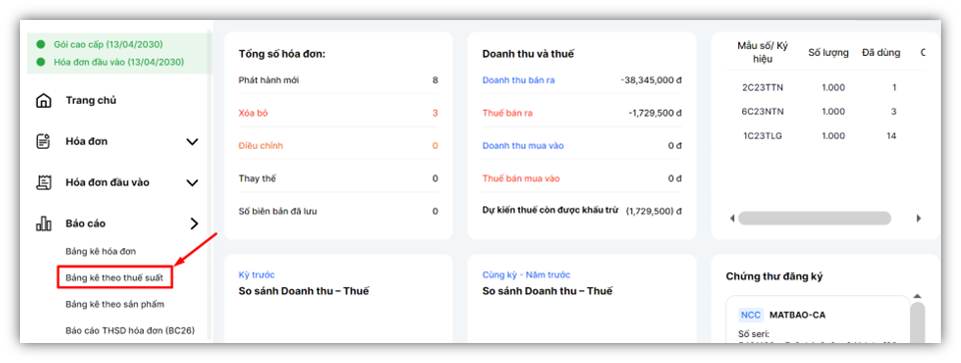 Ngay tại mục trang Quản lý Hóa đơn, trong mục Báo cáo, chọn Bảng kê theo thuế suất