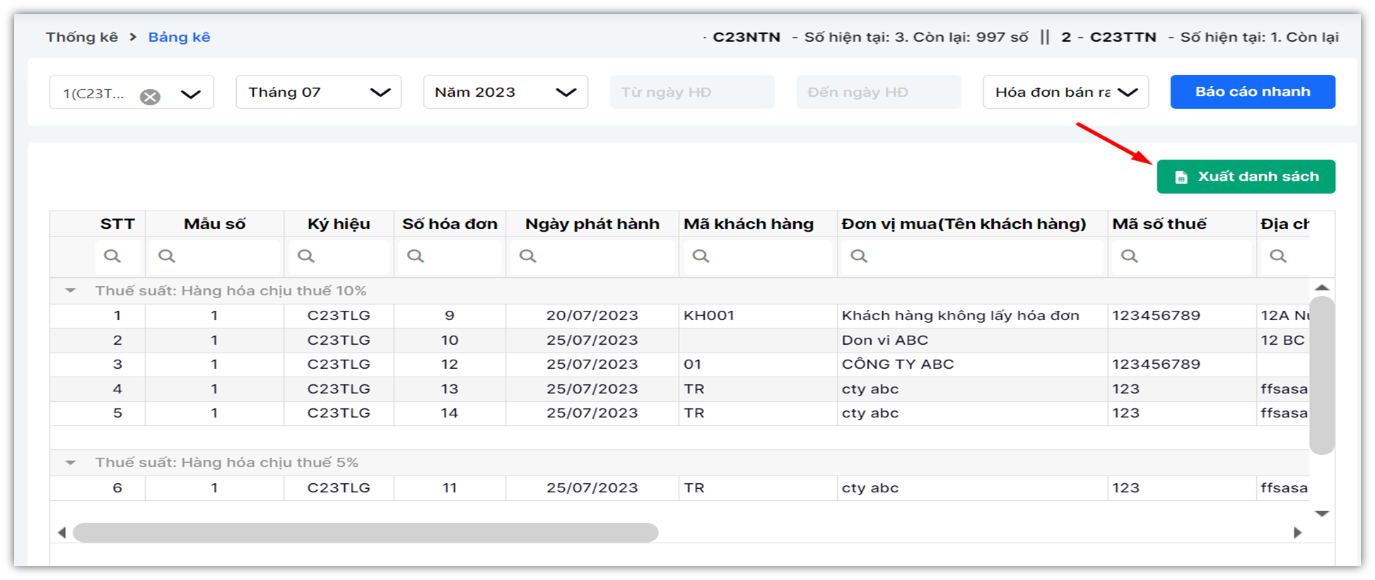 Trong bảng kê theo thuế suất, bạn chọn mẫu số và ký hiệu hóa đơn, tháng/ quý và năm muốn xem, sau đó nhấn Báo cáo nhanh.