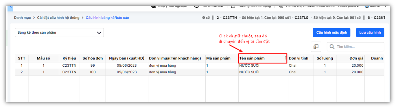 Bạn có thể cấu hình vị trí các cột trong bảng kê/ báo cáo theo ý muốn của bạn.