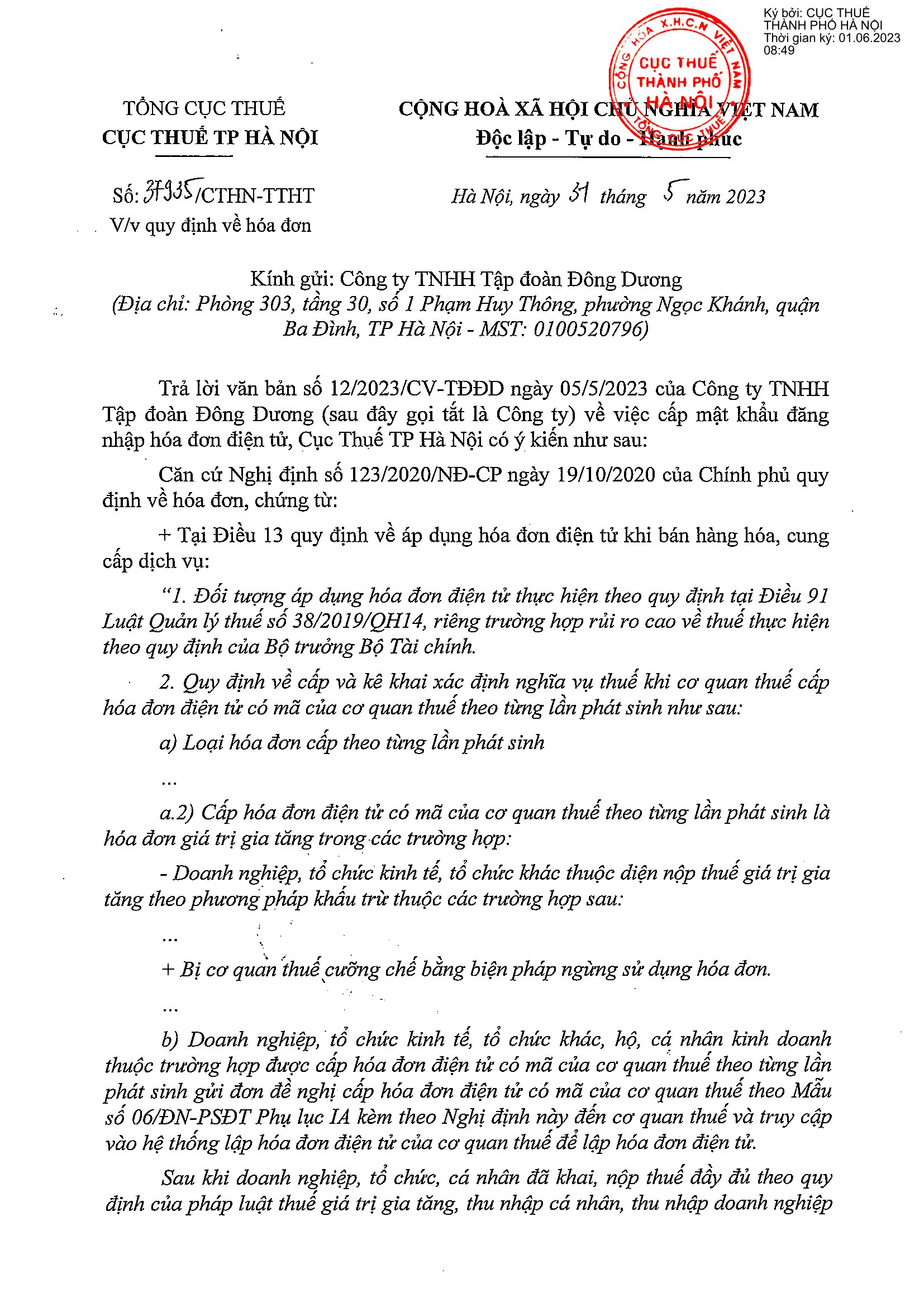 Trả lời văn bản số 12/2023/CV-TĐĐD ngày 05/5/2023 của Công ty TNHH Tập đoàn Đông Dương (sau đây gọi tắt là Công ty) về việc cấp mật khẩu đăng nhập hóa đơn điện tử, Cục Thụế TP Hà Nội có ý kiến như sau: