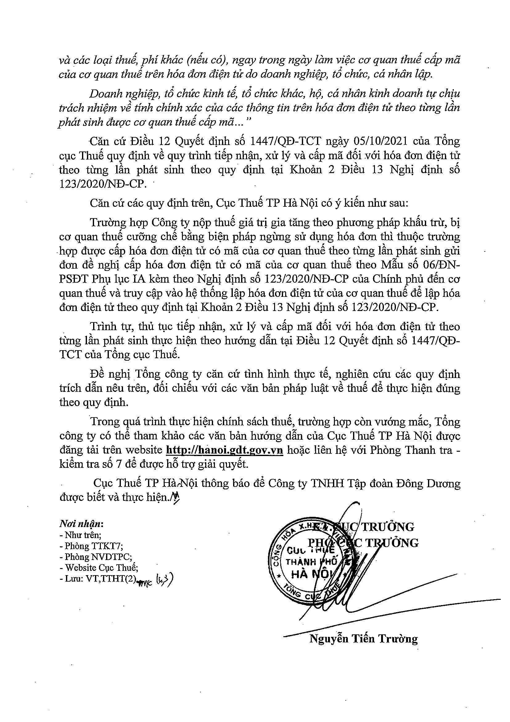 Cục Thuế TP Hà Nội thông báo để Công ty TNHH Tập đoàn Đông Dương được biết và thực hiện.
