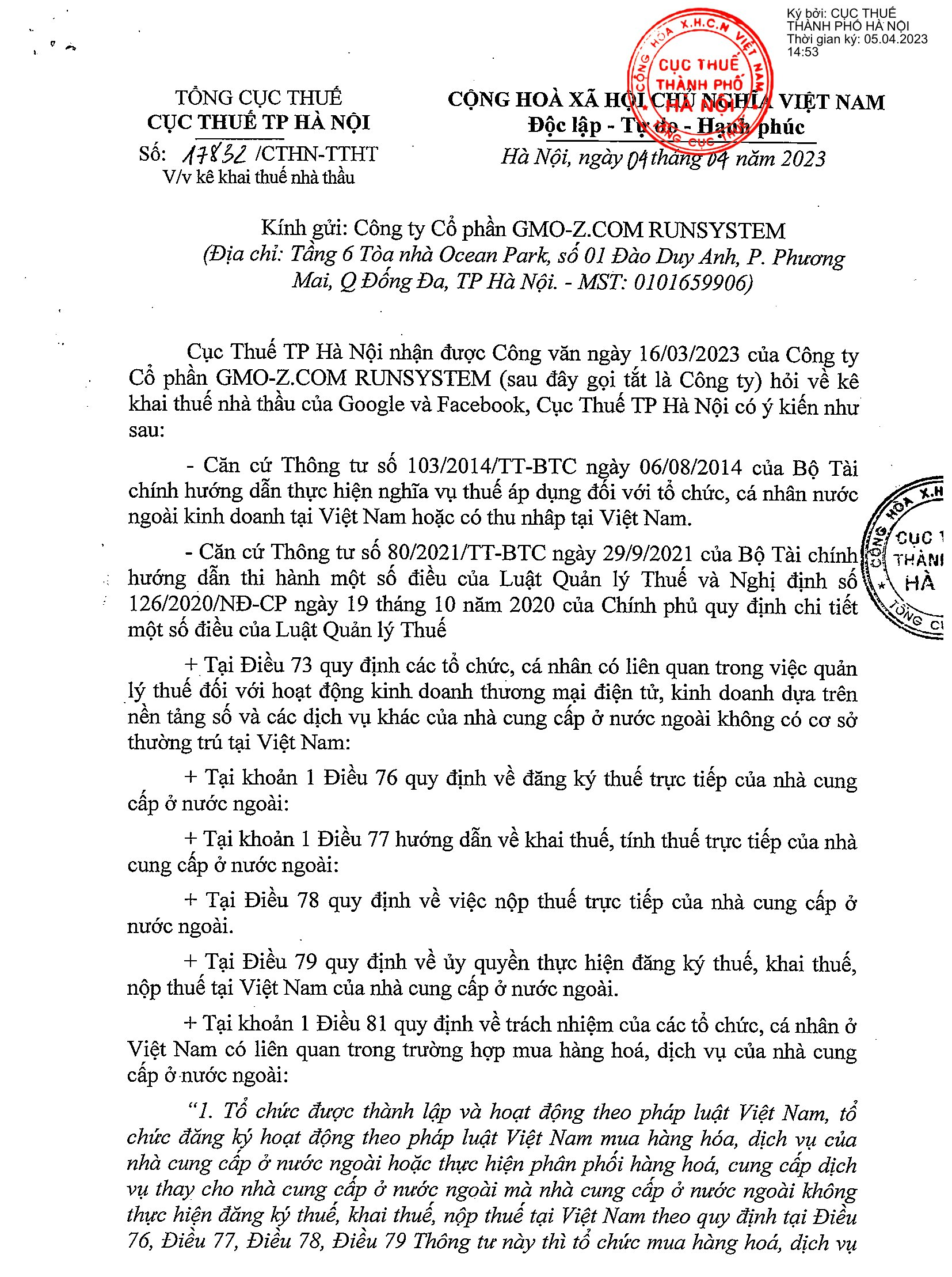 Cục Thuế TP Hà Nội nhận được Công văn ngày 16/03/2023 của Công ty Cổ phần GMO-Z.COM RUNSYSTEM (sau đây gọi tắt là Công ty) hỏi về kê khai thuế nhà thầu của Google và Facebook, Cục Thuế TP Hà Nội có ý kiến như sau: