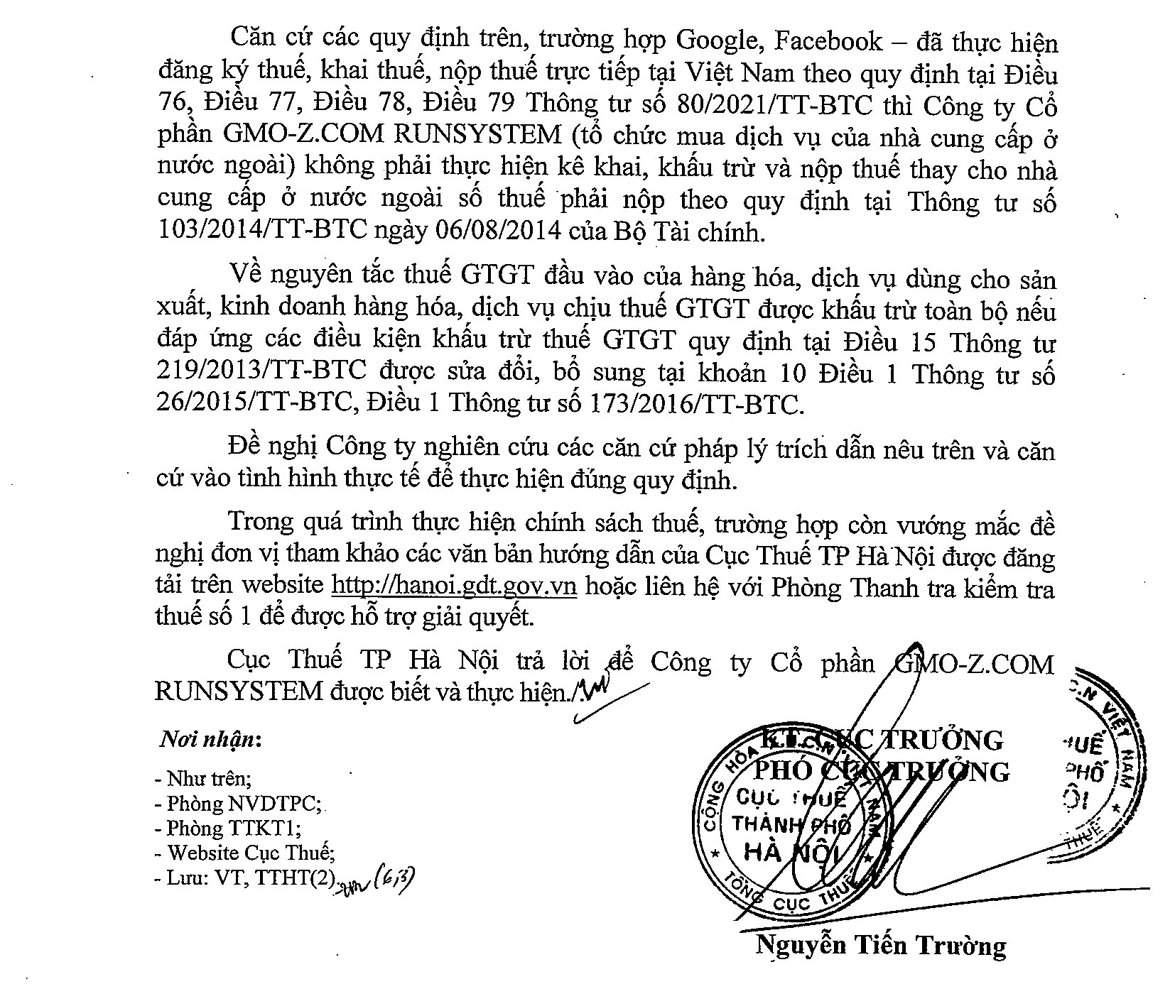 Cục Thuế TP Hà Nội trả lời để Công ty Cổ phần GMO-Z.COM RUNSYSTEM được biết và thực hiện.