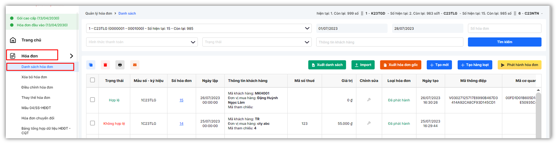 Khi vào trang Danh Sách, sẽ hiện danh sách các hóa đơn đã phát hành và hóa đơn nháp.