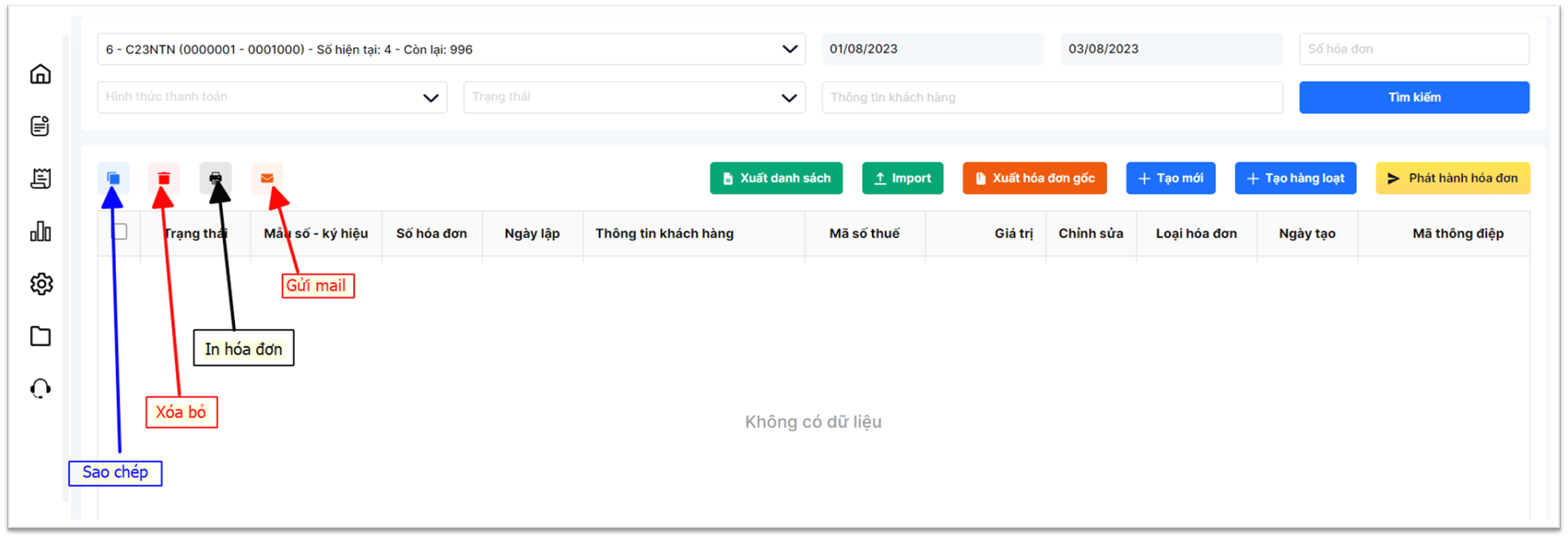 Tại mục Danh sách hóa đơn, có các chức năng : Sao chép hóa đơn, Xóa hóa đơn nháp, In hóa đơn và Gửi thư điện tử như các biểu tượng hiển thị sau:
