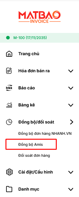 Bước 1: Đăng nhập trang quản lý hóa đơn Matbao-invoice -> vào mục Đồng bộ/đối soát -> chọn Đồng bộ Amis