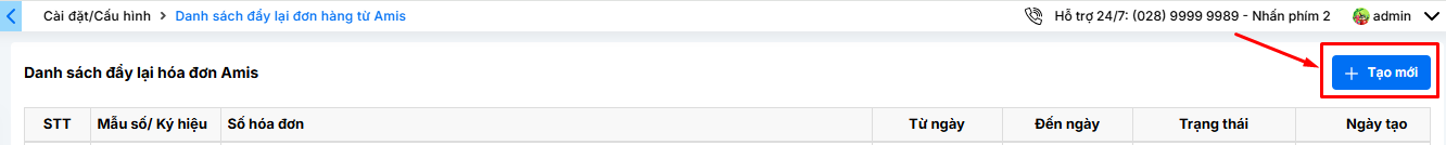 Bước 2: Trên màn hình Danh sách đẩy lại hóa đơn Amis -> Chọn Tạo mới, hệ thống sẽ hiển thị lưu ý trước khi nhập thông tin