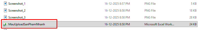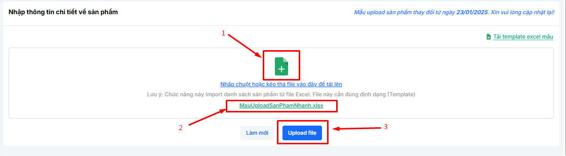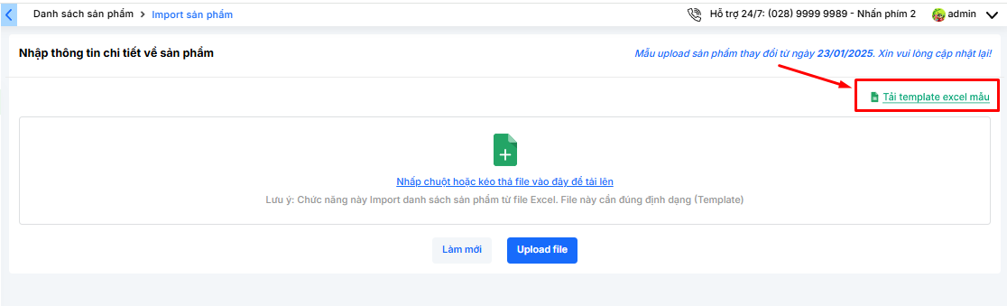 Bước 2: Nhấn chọn Import -> Tải file excel mẫu để nhập dữ liệu import sản phẩm đồng bộ