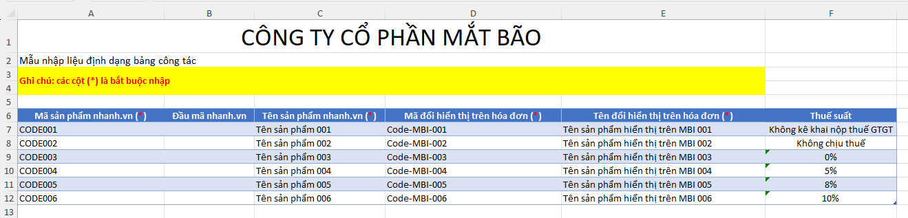 Bước 3: Nhập dữ liệu theo thông tin tiêu đề cột hiển thị trong file.