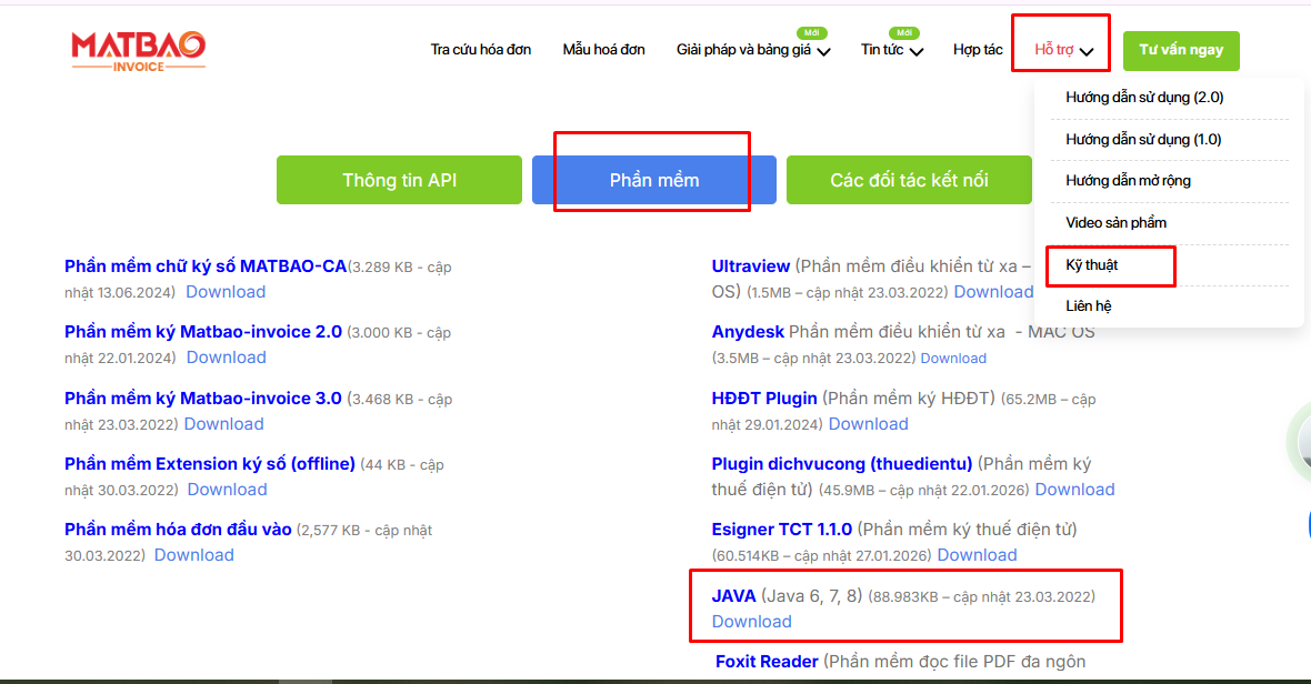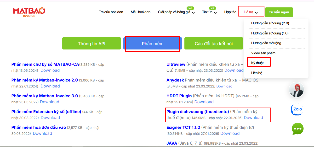Bước 1: Truy cập trang web matbao.in. Trên thanh menu, chọn Hỗ trợ, Kỹ thuật, tại tab Phần mềm.