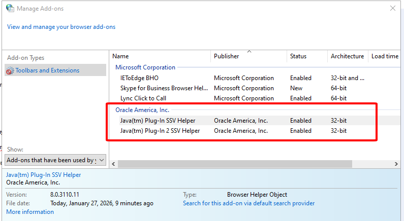 Bước 3: Kiểm tra JAVA có add-ons trên trình duyệt hay chưa.