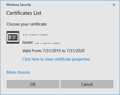 Doanh nghiệp chọn More choices, hệ thống sẽ hiển thị màn hình có chứa danh sách các chữ ký số. NSD thực hiện chọn chữ ký số đã đăng ký để thực hiện ký số.