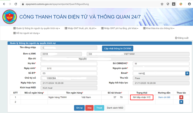 – Chờ NH phản hồi: Trường hợp này yêu cầu gửi đến ngân hàng nhưng chưa được ngân hàng phản hồi – NH không tiếp nhận: Yêu cầu đã gửi đến ngân hàng nhưng ngân hàng không tiếp nhận – NH Tiếp nhận: Khi ngân hàng gửi thông báo xác nhận đã nhận được thông tin từ hải quan gửi sang – NH đã tạo hồ sơ: Ngân hàng phản hồi chấp nhận thông tin về việc ủy quyền trích nợ – NH Từ chối: Ngân hàng không chấp nhận thông tin ủy quyền trích nợ