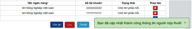 Sau khi hệ thống cập nhật thông tin ủy quyền trích nợ thành công, Doanh nghiệp có thể thực hiện sửa, xóa thông tin đã đăng ký.