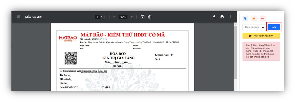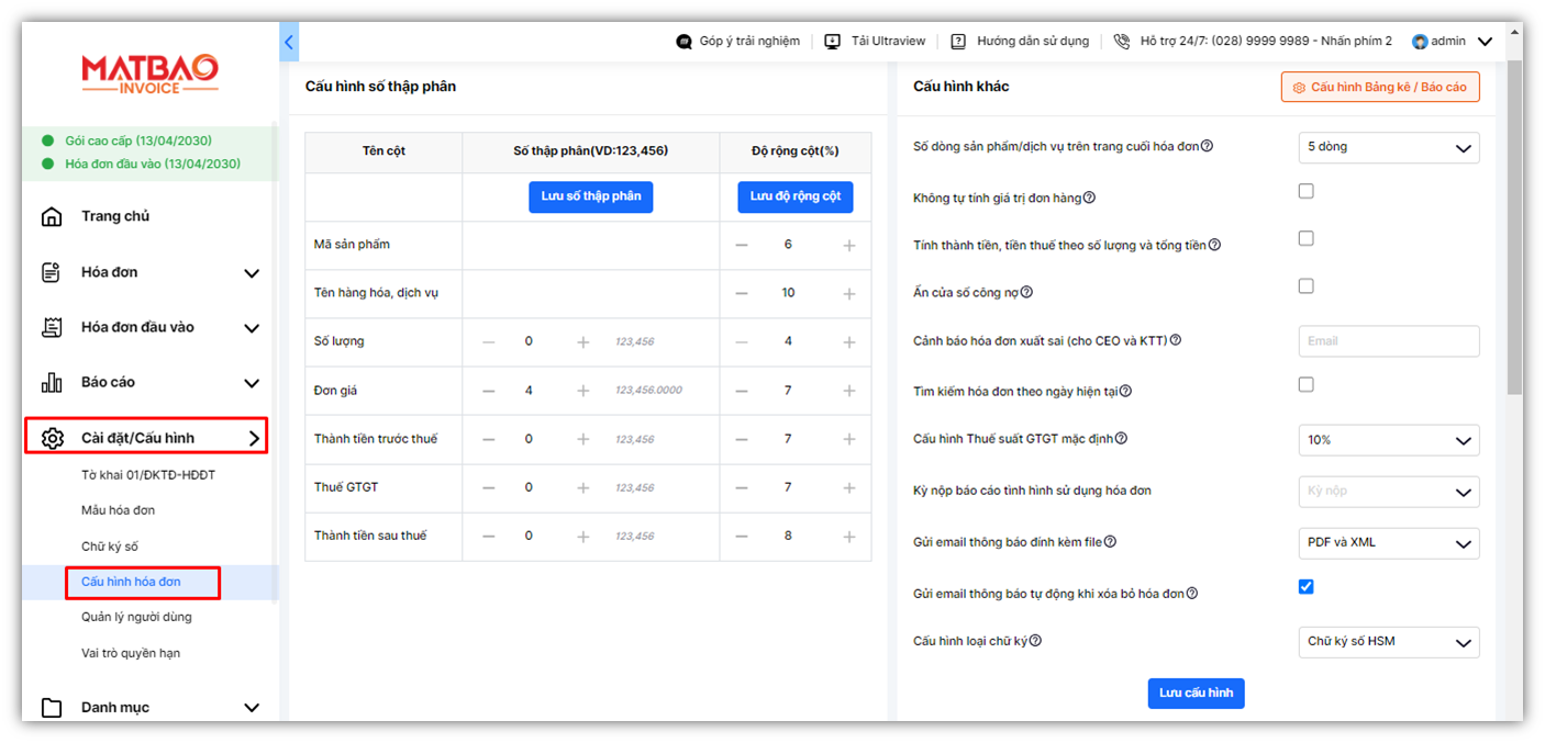 Lưu ý: cấu hình chỉnh thay đổi cho những hóa đơn được tạo mới sau khi cấu hình số dòng được lưu thành công, những hóa đơn đã tạo và phát hành trước đó không bị thay đổi.