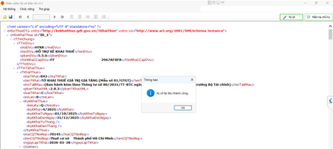 Bước 3: Thực hiện tải tờ khai XML đã ký ….[signed] lên trang Dịch vụ công, bỏ qua bước Ký hồ sơ và nhấn Nộp tờ khai, hệ thống sẽ trả thông báo Thành công trên màn hình.