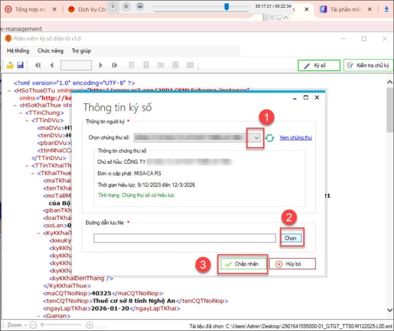 - Tìm chứng thư số của Doanh nghiệp và chọn Đường dẫn lưu file ký trên máy tính