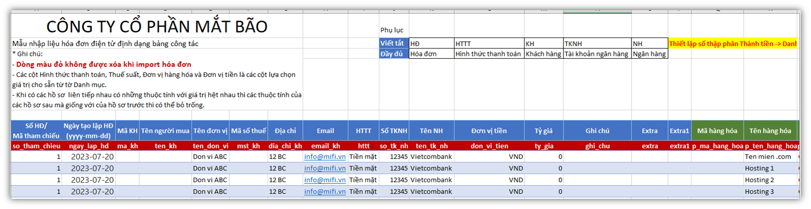 Bước 3: Bạn cần nhập hết tất cả toàn bộ thông tin trên file Excel, nhập nội dung các số hóa đơn cần tạo và lưu ý đánh số thứ tự các tờ hóa đơn, để hệ thống phân biệt được dòng nào thuộc về hóa đơn nào.