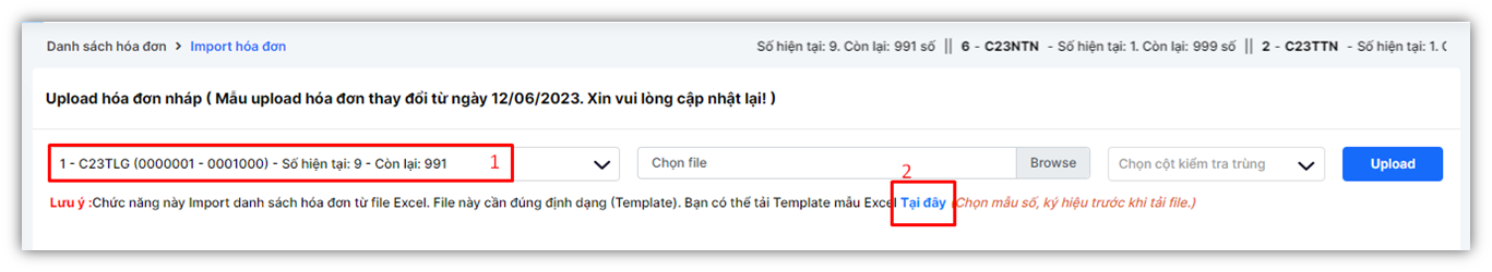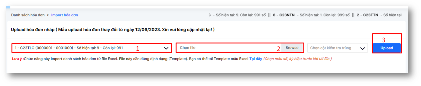 Bước 4: Khi đã điền xong trên mẫu Upload file Excel, bạn chọn mẫu số -> nhấn vào “Browse” để chọn file cần tải lên -> nhấn upload để import toàn bộ dữ liệu hóa đơn trong file excel.