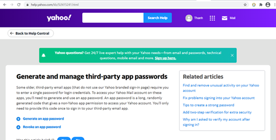 Bước 1: trạng truy cập vào tài khoản Yahoo mail cần thiết lập, truy cập song song 1 tab mới với đường dẫn https://help.yahoo.com/kb/SLN15241.html , hệ thống sẽ hiện thị giao diện như hình bên dưới.
